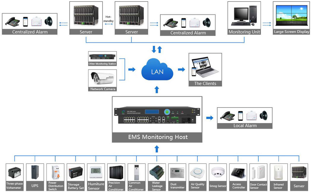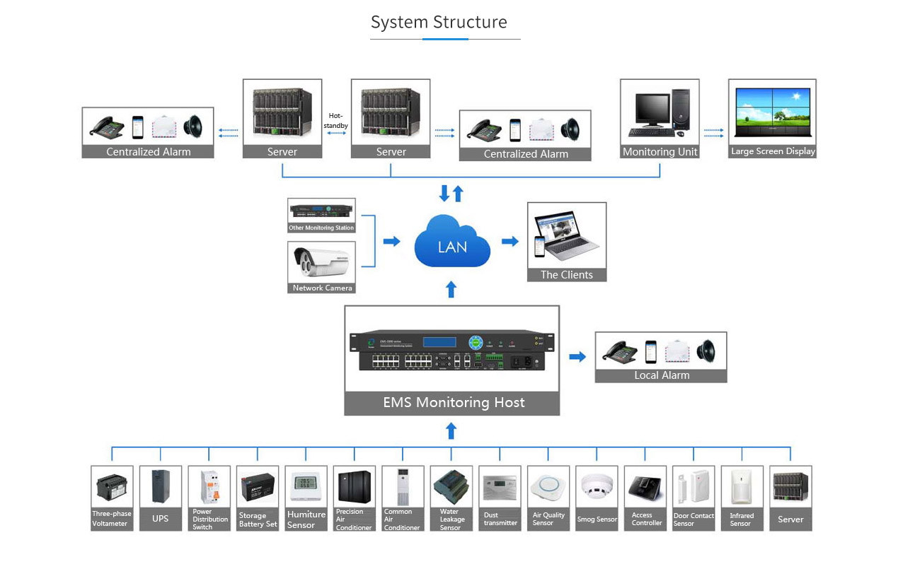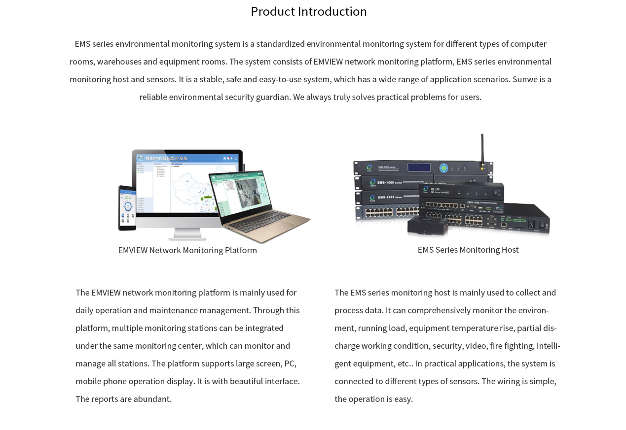 EMS series environmental monitoring system is a standardized environmental monitoring system for different types of computer rooms, warehouses and equipment rooms. The system consists of EMVIEW network monitoring platform, EMS series environmental monitoring host and sensors. It is a stable, safe and easy-to-use system, which has a wide range of application scenarios. Sunwe is a reliable environmental security guardian. We always truly solves practical problems for users.