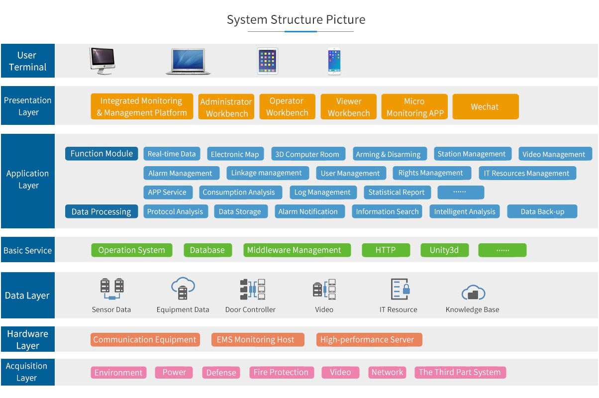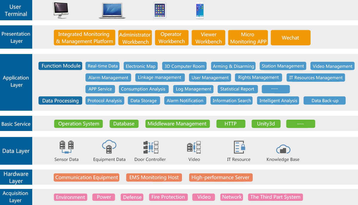 The integrated monitoring and management platform is an environmental monitoring center software product that is developed by Sunwe. It is a comprehensive software platform for networked computer room management business. Through the software, multiple EMS monitoring hosts and other business systems can be integrated under the same monitoring center. The monitoring center implements centralized collection of every monitoring site's over-standard/abnormal/malfunction alarm events, real-time environmental data collecting and the monitored device status information, by that the remotely monitoring and management of various environmental monitoring devices in all computer rooms is realized.