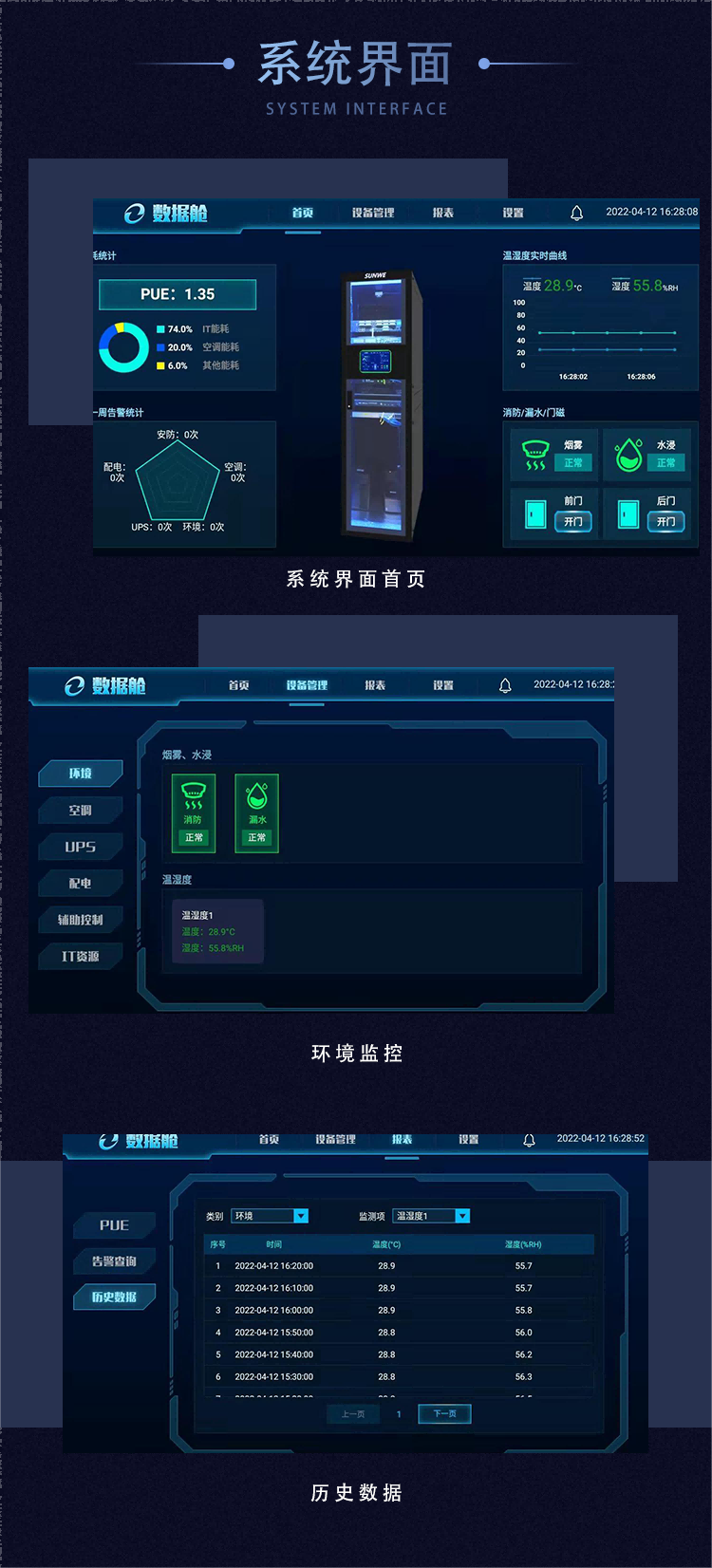 數(shù)據(jù)艙采用了嚴(yán)格的動環(huán)監(jiān)控系統(tǒng),包括煙霧監(jiān)控、溫濕度監(jiān)控、空調(diào)監(jiān)控、視頻監(jiān)控(選配)等,24小時保護(hù)IT設(shè)備安全。